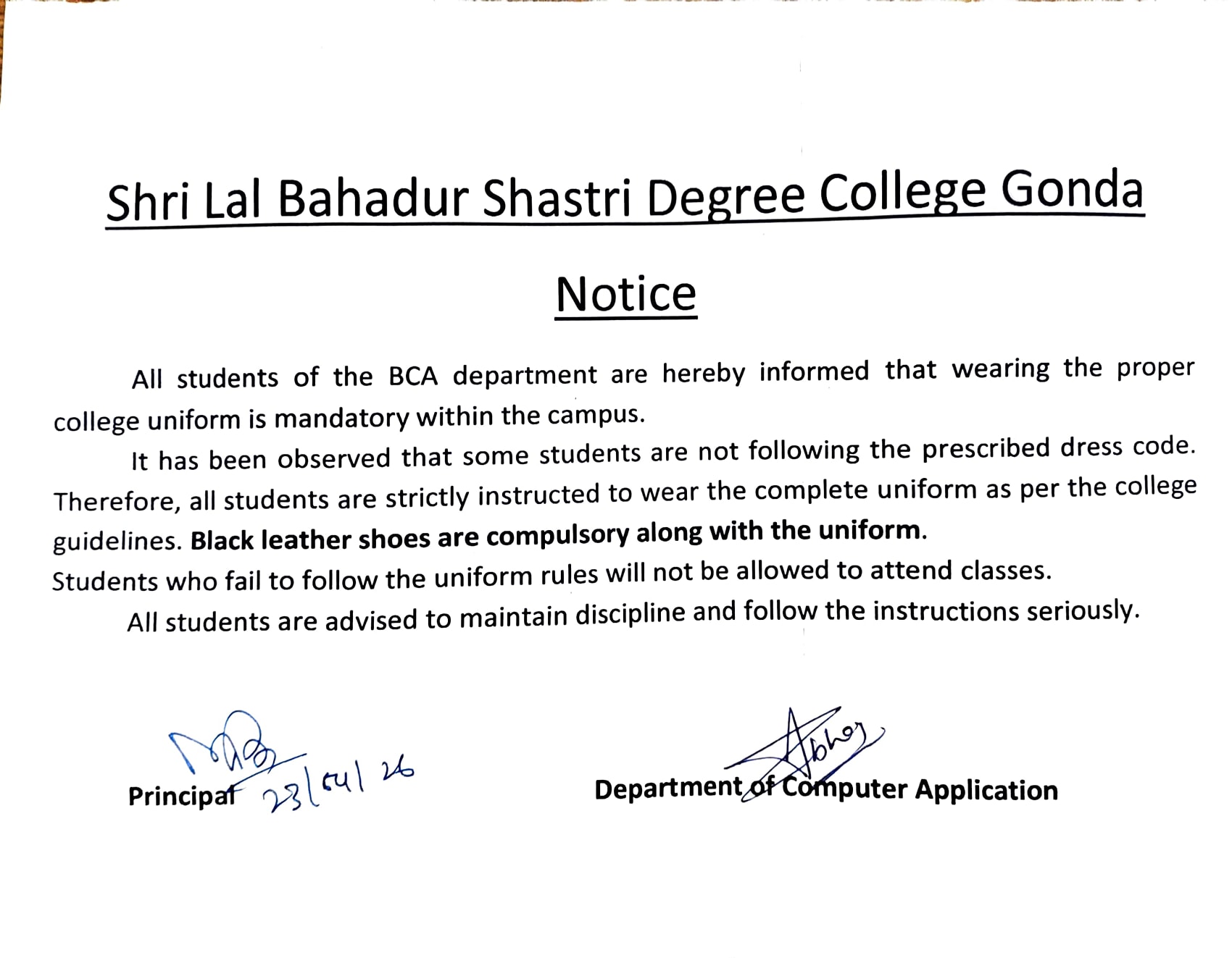 Notice BCA department